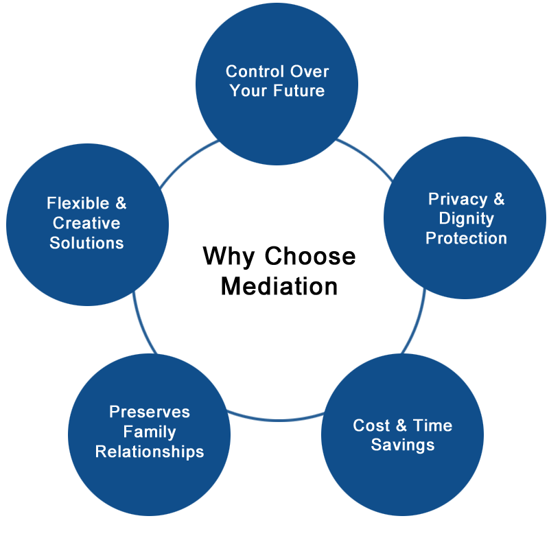The collaborative and thorough nature of the mediation process creates a less stressful, expensive and rigid method for resolve a divorce while preserving relationships between parents and children. It also allows for greater control, as the couple determines their own outcome rather than leaving it to a judge, while keeping private matters from the public record.