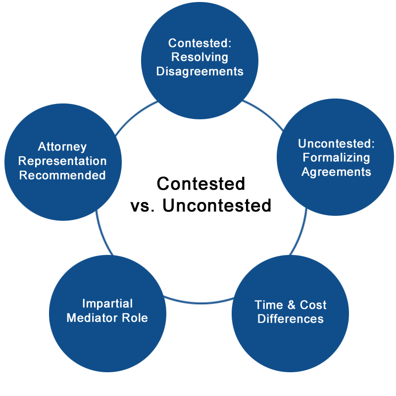 The key difference between the two is the number of issues that the two spouses disagree on. This disagreement level adds to the complexity and cost of a contested divorce vs an uncontested divorce. So in essence, contested divorce mediation helps make a costly and frustrating process less so, while uncontested divorce simply formalizes the elements of the divorce that have already been agreed upon.