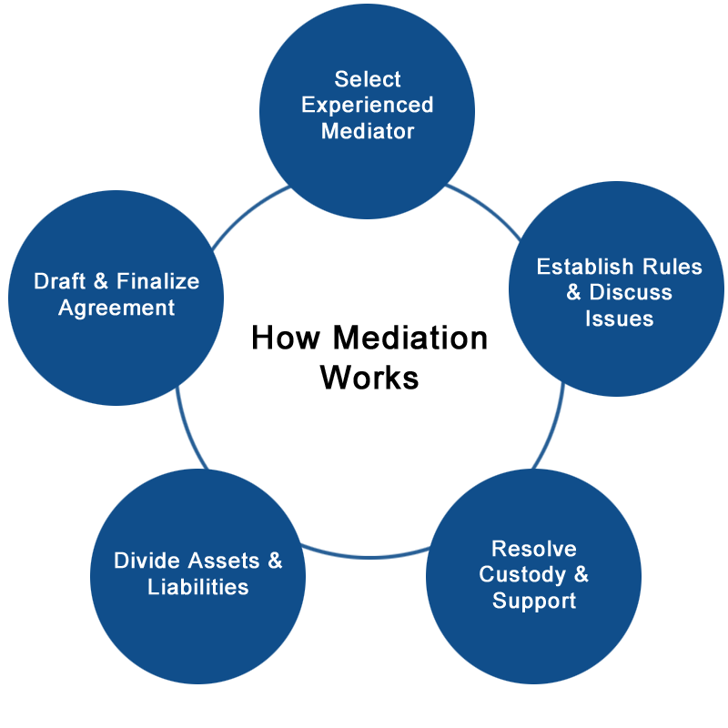 The first step in mediation is to select an experienced mediator, generally an attorney who has experience in family law. As a neutral party, they will collect all necessary information from both parties, such as financial and personal background, to better understand the situation. From there, the meditation sessions will begin, with the couple meeting in person or online with the mediator to discuss key issues. This process generally follows this order: